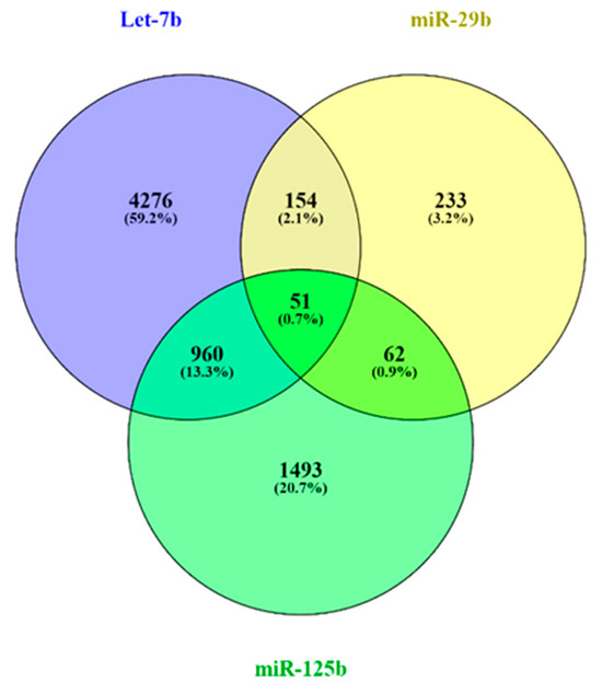 Venn diagram showing the number of unique and common target genes of let-7b, miR-29b, and miR-125b obtained from the miRWalk database, with a binding probability of 1. Graph obtained using Venny 2.1.