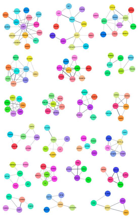 To analyze the biological impact of the three miRNAs, we analyzed the 1227 target genes using the STRINGapp Protein Query from Cytoscape (v3.10.2.) and by applying MCL. PPI networks were generated with a total of 1170 nodes and 629 edges, all with a significant enrichment (p = 1.0 × 10−16) (Figure 4).