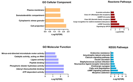 For the functional enrichment analysis, we focused on clusters comprising five or more interactions, obtaining a total of 149 nodes with 243 edges across 21 clusters (Table S2). The analysis was conducted with an FDR threshold of 5%, and redundant terms were removed using a redundancy cut-off of 0.5, which resulted in a total of 28 functional enriched terms among the Reactome, KEGG, and GO categories (Figure 5, Tables S3–S6). Reactome pathways revealed that the targets of the deregulated miRNAs are involved in signaling by GPCR, whereas KEEG pathways demonstrated that miRNAs are involved in cAMP signaling and fatty acid degradation.