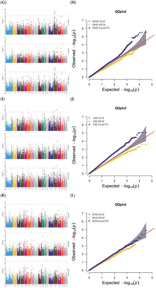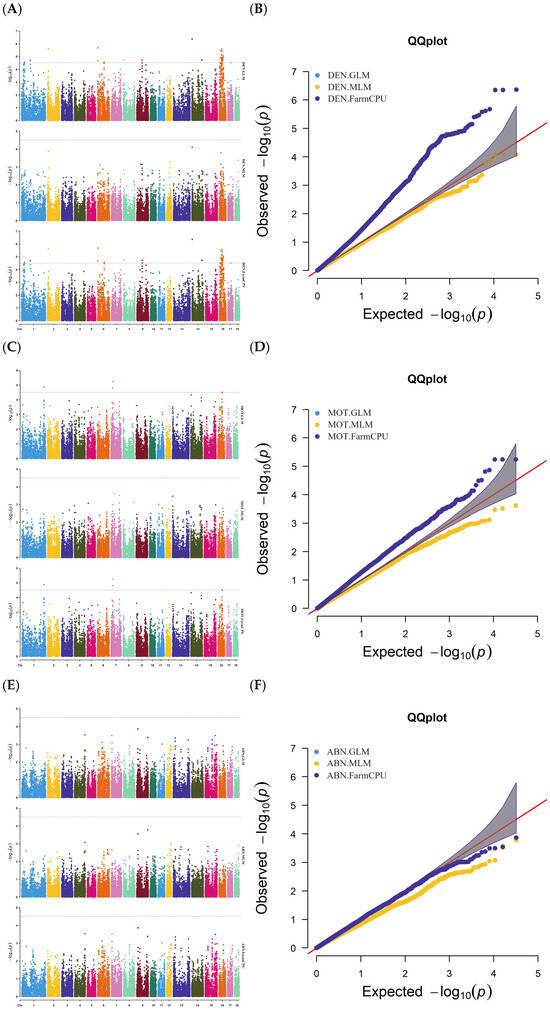 Manhattan and QQ plots obtained from the GWAS of DEN, MOT, ABN, MMP, AIR, and ROS traits in Duroc boars by the three models. The x-axis represents the chromosomes, and the y-axis represents the −log10(p-value). The dashed lines indicate the thresholds for semen traits in pigs after Bonferroni correction. The dashed line in Manhattan plots (A,C,E,G,I,K) indicates the thresholds for semen traits in pigs. Traits considered are semen density (A,B); sperm motility (C,D); abnormal sperm number (E,F); mitochondrial membrane potential (G,H); sperm acrosomal integrity rate (I,J); and reactive oxygen species level (K,L). Abbreviations: GLM = generalized linear models; MLM = mixed linear model; FarmCPU = fixed and random model circulating probability unification.