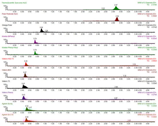 Before starting the extraction method development, several columns were tested to achieve the best separation of the analyte. For each test, a 50 ng/mL standard was diluted in the initial mobile phase and tested with columns with different types of functionalisation and HILIC-functionalised columns. Conventional reverse phase columns were Agilent Zorbax SB-C18 1.8 µm (2.1 × 50 mm) (Agilent Technologies, Santa Clara, CA, USA), Agilent SB-AQ 1.8 µm (2.1 × 50 mm) (Agilent Technologies, Santa Clara, CA, USA), Waters ACQUITY UPLC BEH 1.7 µm (2.1 × 50 mm) (Waters Corp., Milford, MA, USA), Waters ACQUITY UPLC® HSS T3 1.8 µm (2.1 × 50 mm) (Waters Corp., Milford, MA, USA), Waters CORTECS UPLC® T3 1.8 µm (2.1 × 50 mm) (Waters Corp., Milford, MA, USA), Waters CORTECS Phenyl 2.7 µm (2.1 × 50 mm) (Waters Corp., Milford, MA, USA), Phenomenex Kinetex Biphenyl 2.6 µm (2.1 × 100 mm) (Phenomenex, Vaerloese, Denmark), Phenomenex Kinetex Phenyl-Hexyl 2.6 µm (2.1×100 mm) (Phenomenex, Vaerloese, Denmark) and Phenomenex Luna® Omega Polar 1.6 µm (2.1 × 100 mm) (Phenomenex, Vaerloese, Denmark) were considered. A gradient ranging from 5% to 60% Methanol in 5 min after a 1-min isocratic run was applied with a flow rate set at 0.5 mL/min. Moreover, the Thermo Scientific Syncronis HILIC 1.7 µm (2.1 × 100 mm) (Thermo Fisher Scientific, Waltham, MA, USA) and Phenomenex Luna® Polar Pesticides 3.0 µm (2.1 × 100 mm) (Phenomenex, Vaerloese, Denmark) were considered as HILIC-functionalised columns. In this case, a gradient ranging from 95% to 40% Acetonitrile in 5 min after a 1-min isocratic run was applied.