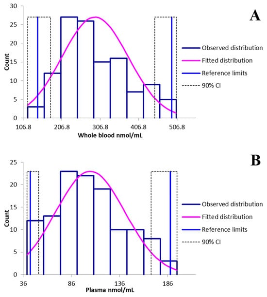 Distribution and reference intervals for taurine in whole blood (A) and plasma (B) with Reference Value Advisor (V2.1) software (Geffré et al., 2011 [30]). CI, confidence interval.