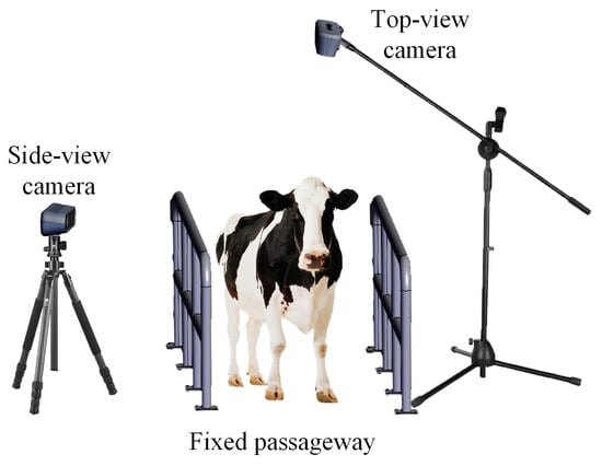 The experimental data were collected at Shengsheng Farm in Luoyang, Henan Province, China, in October 2023. The subjects were lactating Holstein cows. After milking, the cows walked through a fixed corridor to return to the barn, during which filming took place. A depth camera (Intel RealSense D455, Intel, California, USA) was installed directly above the centre of the corridor at a height of 2.8 meters from the ground to capture the top-view depth videos of the cows. Another RGB camera (Nikon D5200, Nikon, Tokyo, Japan) was placed at the side of the corridor, 5.7 m away from the centre of the corridor and at a height of 1.3 m from the ground, to capture the side-view RGB videos. The top-view video was collected to analyse compensatory behaviour of the back key points. The side-view video was collected to conduct artificial lameness scoring and analyse the interaction mechanism between the back key points and the hind limbs. A schematic diagram of the data acquisition setup is shown in Figure 1. Before capturing the walking videos of the cows, a top view depth image of the background (without cows) was taken for subsequent background removal. When the cow’s trunk was fully within the camera’s field of view, both cameras began capturing simultaneously. When the trunk started to leave the camera’s field of view, both depth cameras stopped capturing simultaneously. The video recording process was manually controlled. The top-view video resolution was 640 × 360, with a frame rate of 30 FPS and a pixel depth of 16 bits. The side-view video resolution was 640 × 360, with a frame rate of 30 FPS. Based on the timestamp information, we adjusted and trimmed the videos captured from the two perspectives to synchronise the cow movements in both videos.
