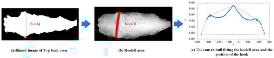 We constructed the convex hull of the Y–Z fitted curve, which was the smallest convex polygon enclosing the curve, as shown by the red curve in Figure 2c. We then calculated the area between the line segment connecting the i-th and (i + 1)-th points of the convex hull and the Y–Z fitted curve. We identified the two points with the largest areas, which indicated the positions of the two local maximum points at the ends of the Y–Z curve. The two points were used as the left and right hook bone points, HL and HR, of the cow, as marked in green in Figure 2c.
