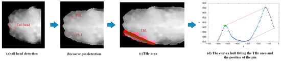We constructed the convex hull of the X–Z fitting curve, as shown by the red curve in Figure 3d. We calculated the area between the line segment connecting the i-th point and the (i + 1)-th point on the convex hull and the X–Z fitting curve. The point with the maximum area, which determines the local maximum of the X−Z curve’s leftmost extremum, was identified, and we designated this point as the left pin bone point PL2, as marked by the green point in Figure 3d. The method for locating the right pin bone point was similar to that of the left pin bone point and will not be repeated here.