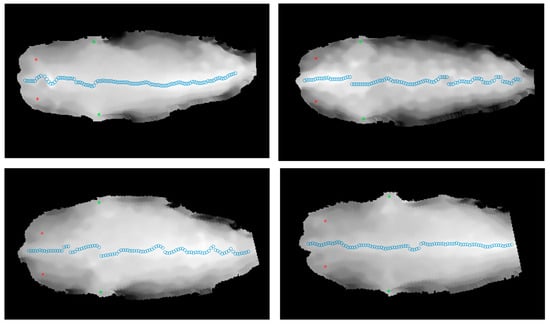 (3) Rough localisation of the pin bones. The 10 rightmost columns of the left pin bone region (pinL) were retained, and the average value of the points in these columns was used as the coordinate value PL1 for the left hook bone. Similarly, we retained the 10 rightmost columns of the right pin bone region (pinR) and used the average value of the points in these columns as the coordinate value PR1 for the right pin bone.