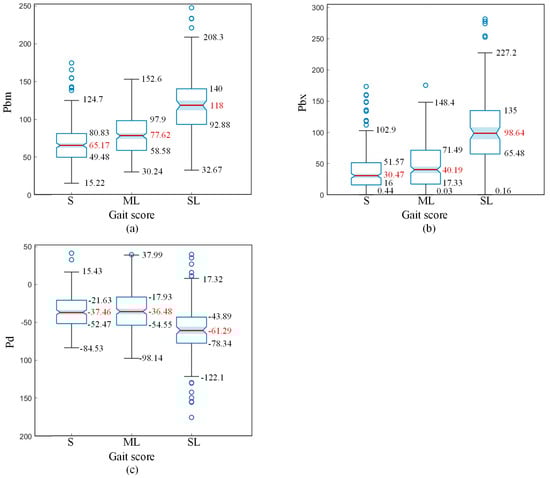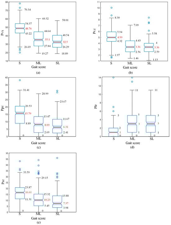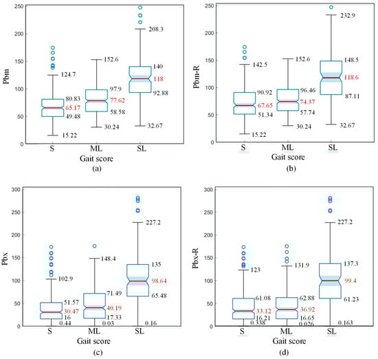 Figure 13c shows the box plot of the Pbx feature of the spine line profile at the suspended point, representing the slope magnitude of the spine line when a cow’s single hind hoof is suspended. Figure 13d presents the box plot of the Pbx-R feature of randomly selected spine line profiles, where each sample is from the first frame of walking videos, making the temporal state random. From Figure 13c,d, it can be seen that the median difference between S and ML samples for Pbx features is 9.72, while for Pbx-R features, it is 3.8. Thus, Pbx features provide better distinction between S and ML samples compared to Pbx-R features. There is not a significant difference in the distribution of Pbx and Pbx-R features between ML and SL samples.