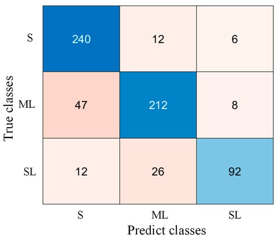 The accuracy of the threshold discrimination method is 83.05%, with a recall rate of 93.02% for sound (S class) samples, achieving precision similar to that of the side-view lameness detection system. This indicates that the threshold discrimination method can accurately identify sound cows. Figure 12 shows the confusion matrix for the classification results. The confusion matrix reveals that misclassified samples often have adjacent scores.