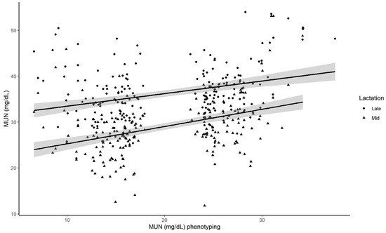 The milk urea N (MUN) values from cows during sampling points at mid and late lactation are affected by the cow MUN value at the phenotyping. For every one-unit increase in MUN at the phenotyping, there was a subsequent 0.35 mg increase in N from urea per dL of milk (p < 0.0001). The sampling period affected the intercept of the regression line (p < 0.0001). The regression model’s adjusted R2 = 0.32.
