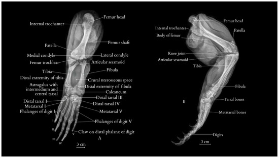 The posterio-anterior (A) and lateral (B) view of the right pelvic limb of the Komodo dragon (X-rays). The following anatomical structures are visible: femur with its internal trochanter and shaft; condyles and intercondylar groove; tibia with its distal extremity; calcaneum; fibula with the distal epiphysis of the fibula; astragalus with intermedium and central tarsal bone; distal tarsal III; metatarsal V; metatarsal I; I—digit I; II—digit II; III—digit III; IV—digit IV; and V—digit V.