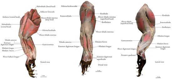 Muscular anatomy of the right pelvic limb, including the following muscles: pubotibial muscle (m. pubotibialis), tibialis anterior muscle (m. tibialis anterior), femoral adductor muscle (m. adductor femoralis), ambiens muscle (m. ambiens) external flexor of the tibia muscle (m. flexor tibialis externus), gastrocnemius muscle (m. gastrocnemius), extensor digitorum longus muscle (m. extensor digitorum longus), fibularis longus muscle (m. fibularis longus), fibularis brevis muscle (m. fibularis brevis), flexor digitorum superficialis muscle (m. flexor digitorum superficialis), flexor digitorum longus muscle (m. flexor digitorum longus), and pronator quadratus muscle (m. pronator quadratus). Labels: I—digit I; II—digit II; III—digit III; IV—digit IV; and V—digit V. The figure on the left illustrates the proximal part of the limb, located closer to the body axis. The central illustration depicts the dorsal aspect of the limb, including the dorsal surface of the pes (dorsum pedis). The figure on the right presents the limb in lateral view (pars lateralis). Images of the pelvic limb are also available in Supplementary Material. Illustration created by A. Tomańska.