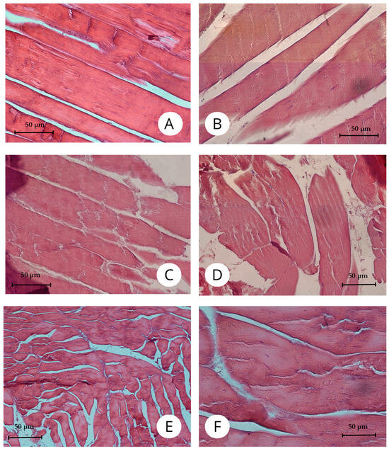 Histological images of selected pelvic limb muscles (HE staining). (A)—ambiens muscle (m. ambiens, dorsal head), Mag 200×; (B)—puboischiofemoral muscle (m. puboischiofemoralis), Mag 200×; (C)—flexor digitorum longus muscle (m. flexor digitorum longus), Mag 200×; (D)—superficial flexor of the tibia muscle (m. flexor tibialis superficialis), Mag 200×; (E)—femorotibial muscle (m. femorotibialis), Mag 200×; (F)—pubotibial muscle (m. pubotibialis), Mag 200×.
