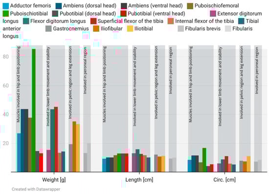 The distribution of muscle fiber diameters (µm, N = 100), circumference (cm), length (cm), and weight (g) across the various muscles of the pelvic limbs is presented. The data were visualized using Datawrapper and correspond to the information detailed in Table 1.