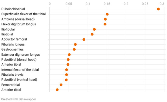 Muscle weight-to-body weight ratios for the pelvic limb musculature of Varanus komodoensis specimen: adductor femoral, 0.089; ambiens (dorsal head), 0.146; iliofibular, 0.117; iliotibial, 0.111; femorotibial, 0.029; extensor digitorum longus, 0.051; anterior tibial, 0.019; flexor digitorum longus, 0.145; superficialis flexor of the tibial, 0.151; internal flexor of the tibial, 0.044; gastrocnemius, 0.064; fibularis brevis, 0.044; fibularis longus, 0.067; anterior ibial, 0.047; puboischiotibial, 0.284; pubotibial (dorsal head), 0.048; and pubotibial (ventral head), 0.044. Visualized using Datawrapper.