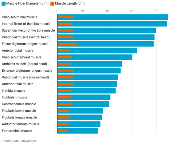 The distribution of muscle fiber diameters, circumference, length, and weight across different muscles in the pelvic limbs was visualized with Datawrapper (https://www.datawrapper.de, accessed on 12 October 2024). Illustrations of the muscles were produced using Adobe Illustrator (Adobe Inc., 2019, San Jose, CA, USA).