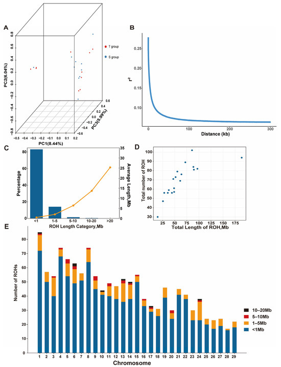 Genetic diversity analysis of the Lüliang black goat (LBG) population. (A) PCA of LBG population; (B) linkage disequilibrium (LD) decay plot of the LBG population; (C) frequency (bar graph) and average length (orange line) of ROHs in different length categories; (D) total length of ROHs and total number of ROHs for per goat; (E) number of ROHs in the different ROH length categories on each chromosome in the LBG population.