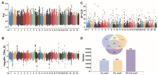 Manhattan plots of the selection signatures detected in the Lüliang black goat (LBG) population by the genetic differentiation index (Fst) (A), nucleotide diversity (π) (B), and cross-population composite likelihood ratio (XP-CLR) (C) methods; (D) number of genes annotated by three methods.