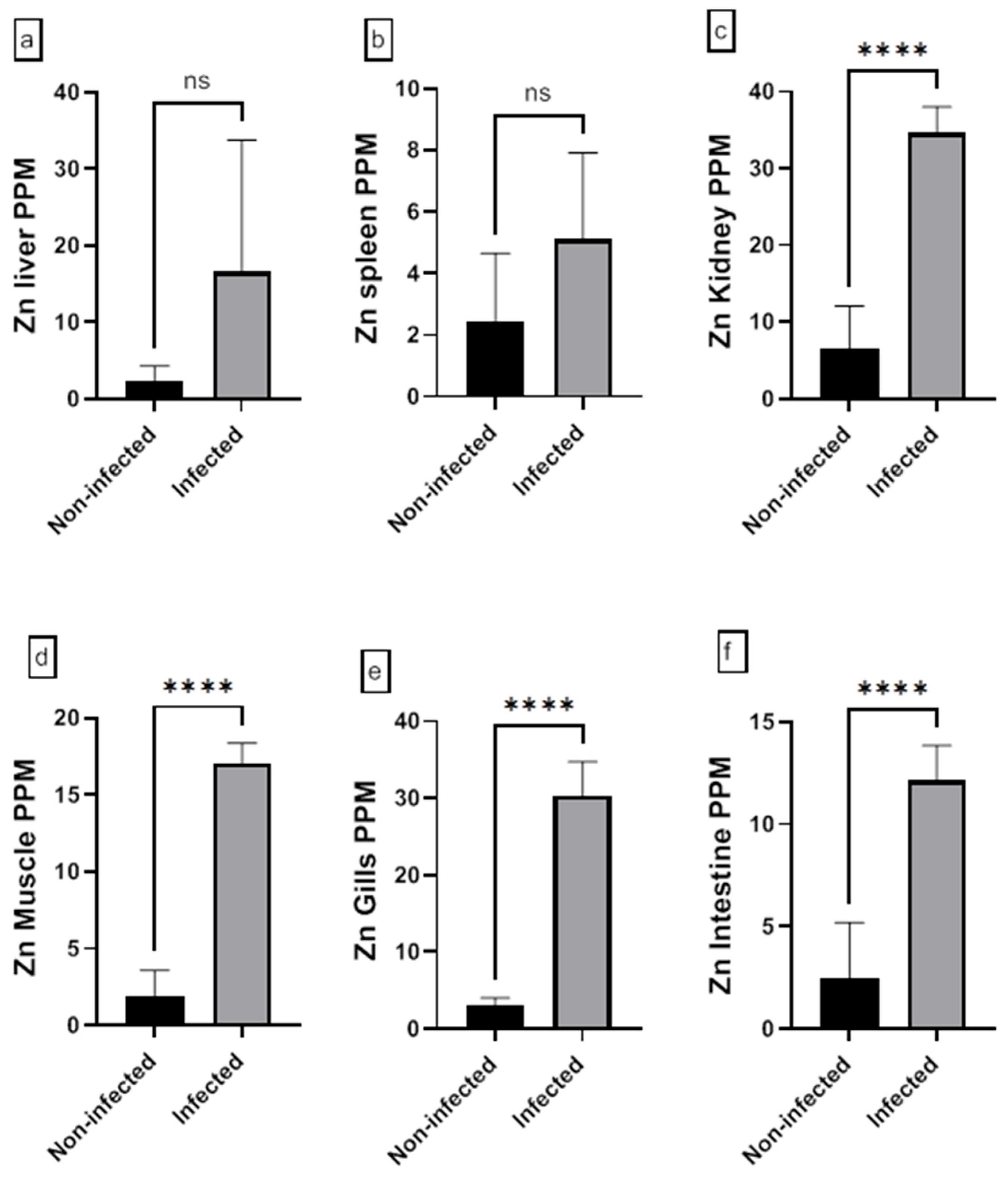 | Parameter | Non-Infected Fish | Infected Fish | p-Value |