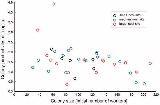 There was no correlation between the colony size (i.e., the initial number of workers) and the colony productivity per capita (r = −0.52, N = 8, p = 0.19, r = −0.44, N = 16, p = 0.089 and r = −0.36, N = 15, p = 0.18, for the ‘small’, ‘medium’ and ‘large’ nest cavities, respectively) (Figure 1).