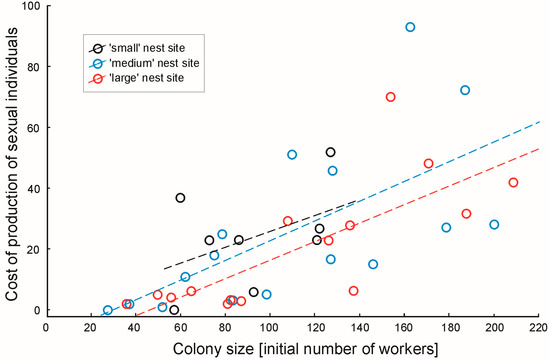 There was no difference in the cost of production of sexual individuals between colonies inhabiting cavities of different volumes (GLM: F2,34 = 1.01, p = 0.37). The production of new workers did not affect the cost of production of sexual individuals (F1,34 = 0.26, p = 0.61); however, the initial number of workers did significantly affect the cost of production of sexual individuals, with more populous colonies investing more in the production of sexual individuals (F1,34 = 19.09, p < 0.0001) (see Figure 2).