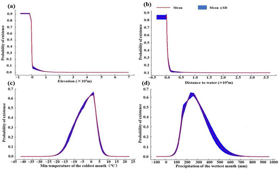 - Wang, J.Y.; Shao, M.Q.; Hu, Q.W. Simulation and evolutionary trend prediction of temporal and spatial patterns of wintering suitable habitat for Leucogeranus leucogeranus under climate and land use change scenarios. Chin. J. Appl. Environ. Biol. 2024, 30, 485–495. [Google Scholar]