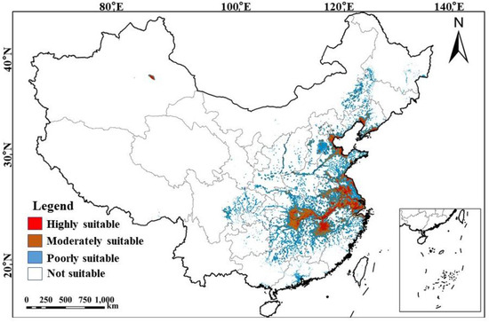 - Fu, A.F.; Gao, E.H.; Tang, X.P.; Liu, Z.L.; Hu, F.X.; Zhan, Z.J.; Wang, J.D.; Luan, X.F. MaxEnt modeling for predicting the potential wintering distribution of Eurasian Spoonbill (Platalea leucorodia leucorodia) under climate change in China. Animals 2023, 13, 856. [Google Scholar] [CrossRef]