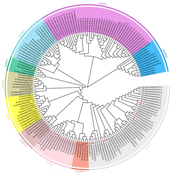 Phylogenetic tree of ScALDH gene family members among six species. The color of the branches represents the same gene family. The red star represents the ALDHs gene family of S. constricta. Abbreviations: Drosophila melanogaster: D. melanogaster; Mercenaria mercenaria: M. mercenaria; Mizuhopecten yessoensis: M. yessoensis; Danio rerio: D. rerio; Mytilus edulis: M. edulis; Sinonovacula constricta: S. constricta.