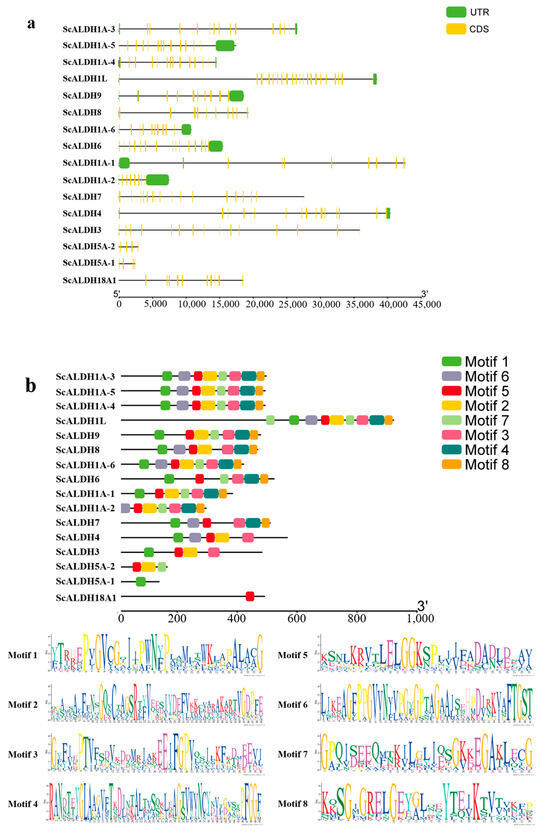 The gene structures of the 16 members belonging to the ScALDH family are shown in Figure 3a. There were variations in both the length and coding region among different genes, with ScALDH1A-1 being the longest and ScALDH5A-1 being the shortest. Analysis of the conserved motifs in the ScALDH superfamily proteins (Figure 3b) revealed significant variability, although the majority of ScALDH motifs within the same subgroup exhibited similarities in both composition and sequence. The ScALDH1 family exhibited the highest degree of conservation, characterized by the presence of eight conserved motifs. Conversely, ScALDH18 solely possessed motif 5, while ScALDH5A-1 was limited to motif 1, due to its relatively short protein sequence. Furthermore, it is noteworthy that a majority of the family members exhibited the occurrence of motif 1, motif 2, motif 6, motif 5, and motif 3.