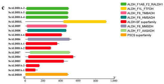 Schematic diagrams of the domains of the ScALDH gene family. (a) Genetic structure diagram of ScALDHs; (b) the conserved motif distributions of ScALDHs; (c) conservative domain analysis of ScALDHs.