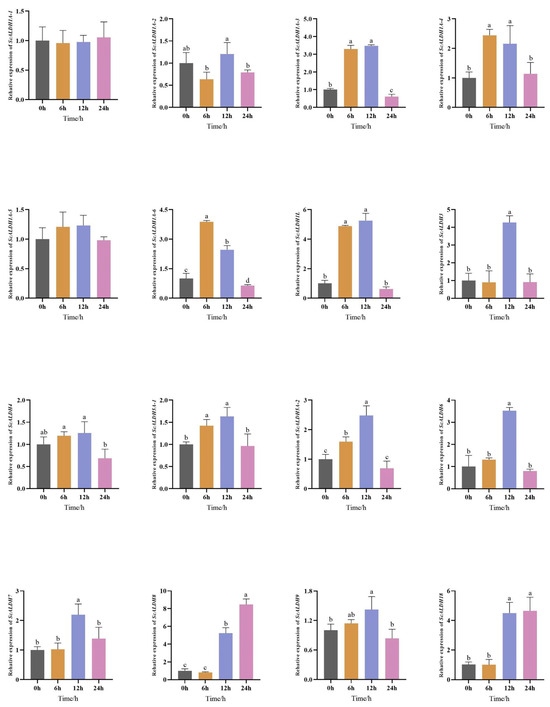 The members of the ALDH superfamily in the gill tissue of razor clams at a salinity of 40 were quantitatively analyzed, and the results are shown in Figure 4. All ScALDH genes were expressed in gill tissues, with significant changes (p < 0.05) in 14 genes after acute high salt stress, except for ScALDH1A-1 and ScALDH1A-5. Compared to the initial time point (0 h), the expression of ScALDH1A-2 initially increased and then decreased, reaching its peak at 12 h. Similarly, the expression levels of ScALDH1A-3~ScALDH7 and ScALDH9 exhibited an initial increase followed by a decrease, peaking at either 6 h or 12 h before returning to baseline gene expression levels at 24 h. Notably, both ScALDH8 and members of the ScALDH18A1 family showed a consistent increasing trend throughout the entire duration, reaching their highest levels at 24 h. The difference between expressions at 12 h and 24 h compared to that at time point 0 h was highly significant.