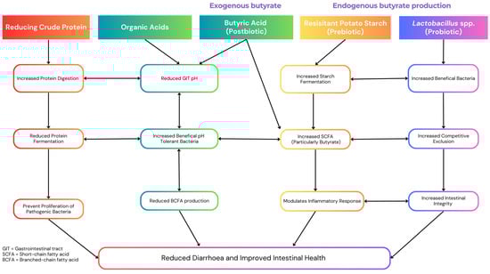 In conclusion, lowering dietary CP levels effectively reduces the availability of undigested substrates in the gut, limiting the proliferation of pathogenic bacteria and mitigating PWD. This approach improves gastrointestinal health and promotes a more stable gut microbiome. The incorporation of organic acids further supports gut health by lowering gastric pH, inhibiting harmful bacteria, enhancing nutrient digestibility, and fostering the growth of beneficial microbial populations. Strategies to increase gut butyrate levels, whether through direct supplementation or by stimulating endogenous production, provide critical benefits, including anti-inflammatory effects, improved intestinal integrity, and enhanced immune function, which collectively strengthen the piglet’s resilience during the post-weaning period. Integrating these approaches offers a sustainable and multifaceted strategy to improve weaning outcomes by optimising nutrient utilisation, enhancing growth performance, and promoting a balanced intestinal environment while reducing reliance on antimicrobials. These interventions have the potential to address the physiological and microbial challenges of weaning and support lifelong gut health.