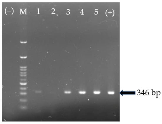 Detection of the GgVg1 genome using PCR. M: 100 bp marker, wells 1–5 were field samples; well (+)/(−) was positive control/negative control.