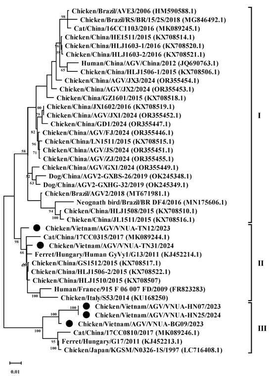 Five representative GyVg1-positive samples collected from suspected chicken flocks in HN, TN, and BG were sequenced. The complete genome of five Vietnamese GyVg1 strains were named as Chicken/Vietnam/AGV/VNUA-HN07, -HN25, -TN12, -TN31, -BG09/2023, with shortened names of VNUA-HN07, VNUA-HN25, VNUA-TN12, VNUA-TN31, VNUA-BG09, respectively.