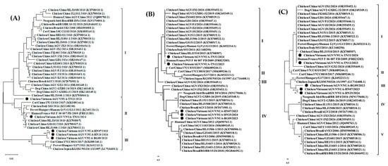 Phylogenetic trees of VPs (A) 1 (460 amino acids), (B) 2 (125 amino acids), and (C) 3 (125 amino acids) proteins of Vietnamese GyVg1 strains compared with those sequences retrieved from GenBank. The maximum likelihood method in MEGA6 was used to build the phylogenetic trees with 1000 bootstrap replicates. Black filled circles show Vietnamese GyVg1 strains.