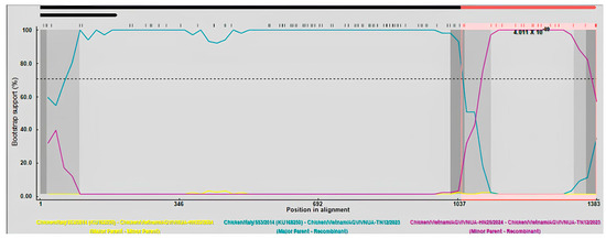 BootScan analysis was used to identify recombination events based on the full-length VP1 gene sequences of Vietnamese GyVg1 strains. Algorithms implemented in the RDP program were used with 1000 bootstrap replicates. Yellow, green, and violet lines indicates as minor parent, major parent, and recombination strains, respectively.