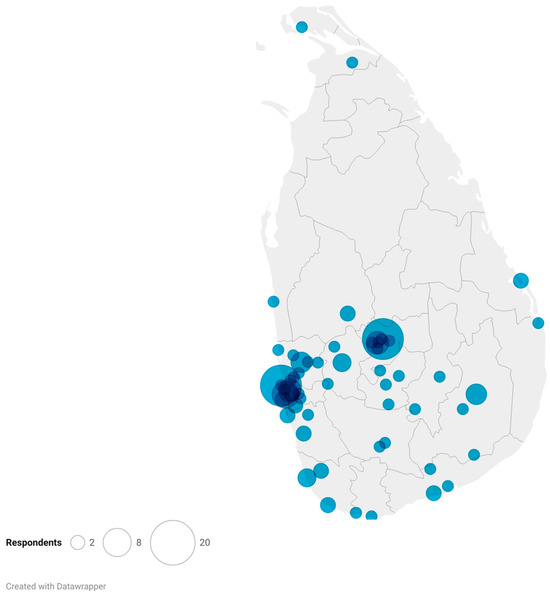 There were 134 surveys returned, of which 127 respondents (14.2% of the estimated population) had completed one or more sections of the survey, consistent with a 95% confidence level with a sampling error of 8%. Not all respondents answered all the questions. Therefore, for the results of each question, the denominator reflects the number of veterinarians who responded to that question. Most respondents were from the geographic south of Sri Lanka, with the highest numbers from the population centers of Colombo and the surrounding Western Province, as well as Kandy and the surrounding Central Province (Figure 1). There was limited participation from veterinarians located in the northern provinces, indicating a risk of sampling bias.