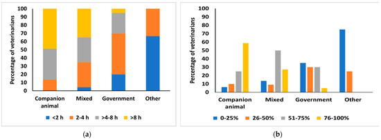 Companion animal veterinarians more frequently worked with companion animals for more than 8 h daily than veterinarians engaged in mixed, government, or other practice types (Figure 2a), and they were usually working in practices with a predominant companion animal caseload (Figure 2b). Government veterinarians saw a low percentage of companion animal caseloads in their practices.