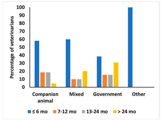 Surveys in which the respondent had completed one or more sections of the questionnaire were retained for analysis. Survey data were transcribed and entered into a spreadsheet (Microsoft Excel, Version 2312, Microsoft Corporation, Mississauga, ON, Canada). Data were checked for errors. Respondents were asked to classify their field of practice as companion animal (CA), mixed practice (MP), government practice (GV), or other. Those that indicated multiple practice fields CA-GV (n = 1), CA-MP (n = 1), and GV-MP (n = 1) were reclassified to CA, MP, and GV, respectively, before further data analysis was performed. For variables where a numerical response was requested, but the respondent gave a value range, the mid-value of the range was used for further analysis.