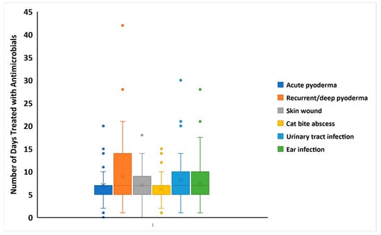 There was a significant difference in antimicrobial treatment duration among acute pyoderma cases, recurrent or deep pyoderma, canine skin wounds, cat bite abscesses, and urinary tract infections (p = 0.0004) (Figure 4). Post hoc analysis found that the duration of antimicrobial treatment for recurrent/deep pyoderma was significantly longer than that used in cases of acute pyoderma (p = 0.0013), skin wounds (p = 0.0041), or abscesses (p = 0.0011). There were no other significant differences.