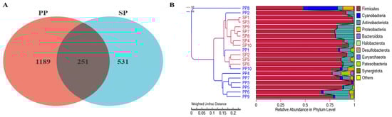 To compare the fecal microbiota between the parent pigeons (PP group) and squabs (SP group), a Venn diagram analysis based on Operational Taxonomic Units (OTUs) and Unweighted Pair Group Method with Arithmetic Mean (UPGMA) clustering was conducted. As shown in Figure 1A, the Venn diagram revealed 251 shared OTUs between the SP and PP groups, indicating a common set of species and highlighting a fundamental similarity in their microbiota. However, the SP group contained 531 unique species, while the PP group had 1189 unique species, underscoring significant differences in microbial composition between the two groups. The UPGMA clustering tree further demonstrated that the fecal microbiota of the SP and PP groups form distinct clusters, reinforcing the independence and diversity of their microbiota profiles.