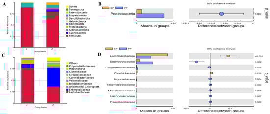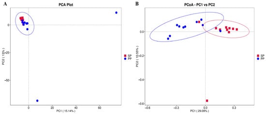A principal component analysis (PCA) and principal coordinate analysis (PCoA) were utilized to visually assess the microbiota similarities and differences between the SP and PP groups. As shown in Figure 2A, the first principal component (x-axis) explains 15.14% of the variation, while the second principal component (y-axis) accounts for 13.04%. Although some differences in bacterial composition between the PP and SP groups are observed, their microbiota exhibit a substantial degree of similarity. PCoA further refines this by providing a clearer representation of the bacterial composition distribution. In Figure 2B, the first principal coordinate (x-axis) accounts for 29.09% of the variation, with the second coordinate (y-axis) explaining 10.55%. These results align with the PCA results, reinforcing the similarity in bacterial composition between the two groups and confirming the close relationship of their microbiota.