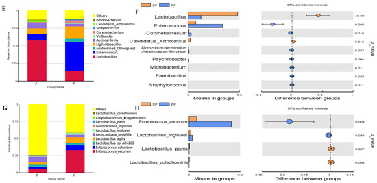 Following the PCA and PCoA analyses, a more detailed examination of the fecal microbiota composition between the SP and PP groups was performed by evaluating changes in relative abundance at various taxonomic levels (Figure 3). As shown in Figure 3A,B, the top ten dominant phyla in both groups are identical, ranked by abundance as Firmicutes, Cyanobacteria, Actinobacteriota, Proteobacteria, Bacteroidota, Halobacterota, Desulfobacterota, Euryarchaeota, Patescibacteria, and Synergistota. Together, these phyla comprise over 99.97% of the total microbial community. A notable difference is observed in the abundance of Proteobacteria, which significantly varies between the SP and PP groups (15.47% vs. 84.53%, p < 0.01). Certain species of Proteobacteria play a role in nutrient absorption, metabolite production, and microbial interactions, suggesting that this discrepancy may reflect differences in nutrient utilization and metabolic regulation between squabs and parent pigeons. As shown in Figure 3C,D, the dominant bacterial groups in both the SP and PP groups account for over 93.19%, predominantly consisting of Lactobacillaceae and Enterococcaceae. In Figure 3E,F, the primary fecal bacteria in both groups represent more than 87.15%, with Lactobacillus and Enterococcus being the most abundant. Figure 3G,H highlight key bacterial species, accounting for over 26.00% in both groups, including Enterococcus cecorum, various Lactobacillus species, and Corynebacterium kroppenstedtii.