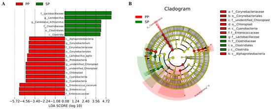 Significant differences were assessed using Linear Discriminant Analysis Effect Size (LEfSe), with a linear discriminant analysis score > 4 and a p-value < 0.05. (A) Histogram of LDA scores showing significant bacterial taxa that differ between the PP (red) and SP (green) groups; (B) Cladogram showing the phylogenetic relationships of significantly different taxa between the PP (red) and SP (green) groups.