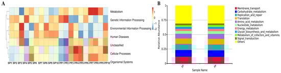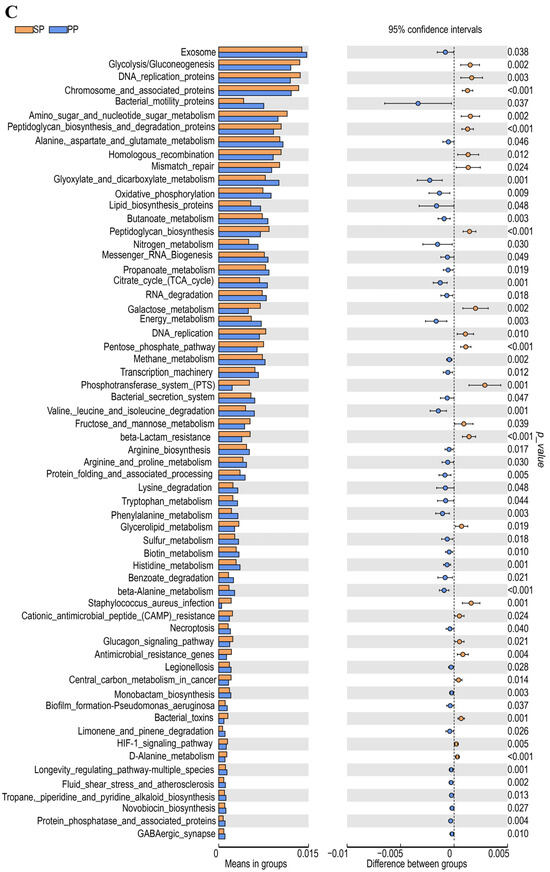 At the Level 3 functional analysis (Figure 5C), significant differences (p < 0.01) were observed between the SP and PP groups across several key metabolic and biosynthetic pathways.