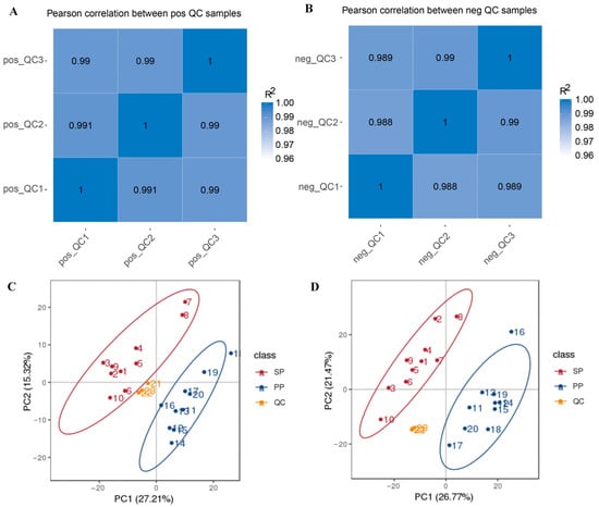 To further investigate the complex relationship between the gut microbiota and metabolites in the SP and PP groups, an integrated analysis combining 16S rRNA sequencing and metabolomics was conducted. The correlation of the QC samples with the PCA results provided essential quality control metrics. As shown in Figure 6A,B, the correlation of the QC samples exceeded 0.99 in positive ion mode and 0.98 in negative ion mode. Additionally, in both ion modes, the QC samples formed tight clusters, as depicted in Figure 6C,D, indicating minimal variance among them. These results confirm that the LC-MS-based metabolite detection in this study demonstrates outstanding stability and data quality, ensuring robustness for subsequent analyses.