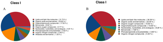 Classification of fecal metabolites. (A): Classification of metabolites in feces in positive ion mode. (B): Classification of metabolites in feces in negative ion mode.
