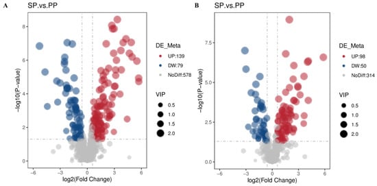 The volcano plot provides a clear visualization of the distribution of differential metabolites. The x-axis represents the fold change (log2) of the metabolites between the groups, while the y-axis indicates the significance level (−log10 (p-value)). Each point on the plot corresponds to a metabolite, with significantly upregulated metabolites shown as red dots, significantly downregulated metabolites as blue dots, and the dot size reflecting the VIP value. Figure 8A displays the differential metabolic volcano plots for positive ion mode, and Figure 8B shows those for negative ion mode.