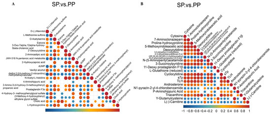 Correlation analysis of the differential metabolites in the feces. (A): Correlation analysis of differential metabolites in the feces of the SP and PP groups in positive ion mode. (B): Correlation analysis of differential metabolites in the feces of the SP and PP groups in negative ion mode.