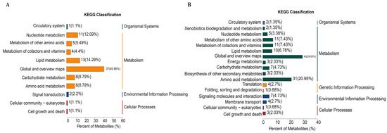 KEGG classification of differential metabolites in feces. (A): Pathway annotation for KEGG in positive ion mode. (B): Pathway annotation for KEGG in negative ion mode.