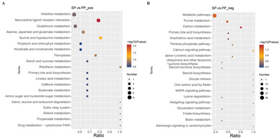 KEGG enrichment pathway analysis of the differential metabolites in the feces. (A): Enrichment results of KEGG in the feces of the SP and PP groups in positive ion mode. (B): Enrichment results of KEGG in the feces of the SP and PP groups in negative ion mode.